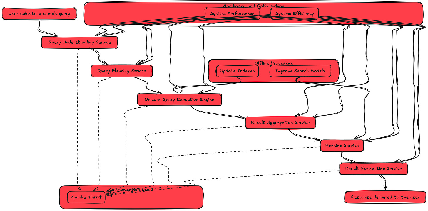 Facebook's Graph Search is capable of processing 2 billion daily queries using Unicorn, a custom-built inverted index and retrieval system, and Apache Thrift for efficient inter-service communication. This sophisticated system forms the backbone of Facebook's ability to provide real-time, personalized search results across its vast social graph.